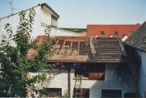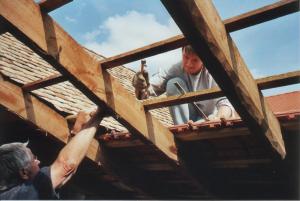 Nebenbei mal Teile des Hofes pflastern, ein paar neue Balken einziehen, um die Geschossdecke wieder herzustellen oder das Dach neu eindecken. Na klar ! Im Folgenden ein paar Bilder vom Wiederaufbau des ehemaligen "Abfüllraumes"