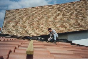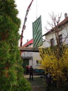 Zusätzlich erschwert wird die ohnehin nicht ganz einfache Arbeit (siehe Länge der Leiter) durch das Gefälle der Strasse. Gut wenn man da eine VW-Pritsche und ein paar geeignete Auffahrrampen hat. Sieht spektakulär aus, ist aber recht sicher und sicherlich besser wie manch andere Konstruktion.